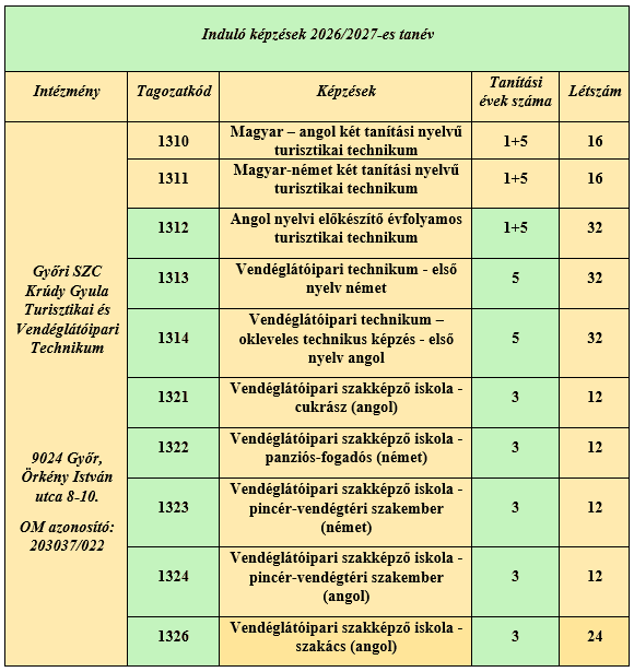 A Győri SZC Krúdy Gyula Turisztikai és Vendéglátóipari Technikum tiszta profilú szakképző intézmény. Ennek köszönhetően a folyamatosan fejlődő turizmus – vendéglátás ágazatban a tanulók korszerű tudást sajátíthatnak el a képzésük során. Bepillantást nyerhetnek az üzleti tevékenység alapjaiba és kihívásaiba. Tanulóink olyan készségek és kompetenciák birtokában kerülhetnek ki az iskolarendszerből, amelyek segítségével megállják a helyüket a negyedik ipari forradalomban átalakuló munkakörökben is. A Krúdy célja, hogy a gazdaság mindenkori igényeihez alkalmazkodni képes piacképes szakma elvégzését biztosítsa tanulói számára. Iskolánk a munkaerő-piaci igényekhez igazodva, a vendéglátás és a turisztika területén képez szakembereket. A Krúdy Győr és a régió elismert és népszerű oktatási intézménye. Nevünk jól cseng diákok és szülők, szakmai szervezetek körében egyaránt. Jelenleg 37 osztályban csaknem 1000 diákunk tanul. A színvonalas szakmai oktatás mellett pezsgő diákélet jellemzi a Krúdyt. A nálunk oktatott szakmákat felnőttoktatás keretében is elsajátíthatják az érdeklődők.